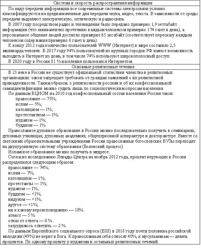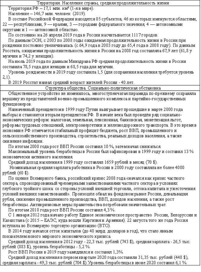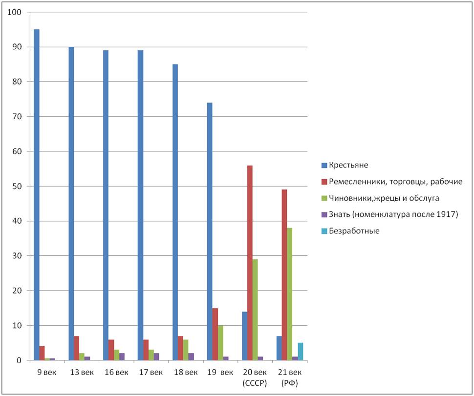 За последнее тысячелетие структура общества кардинально не изменилась. В общественной пирамиде менялись местами слои (крестьяне в 20 веке перестали быть основой общества, их заменили рабочие), по прогнозам футурологов, к концу 21 века основу общества (если не произойдет коренных изменений) будут составлять обслуживающий персонал с чиновниками. Мизерная доля населения (0,5-2%) продолжает владеть и распоряжаться всеми ресурсами и богатствами огромной страны, решая – куда двигаться дальше, кому и чем расплачиваться за свои политические амбиции и желание красиво жить (естественно, за границей и как можно лучше). До 20 века эта мелкая часть населения называлась знатью (дворянство и духовенство) и управляла страной с помощью небольшой (менее 10%) прослойки чиновников. После 1917 года управление страной перешло к группе функционеров (партийные работники, военные начальники и промышленные директора), заявлявших о своей принадлежности к народу (слуги народа), но преследующих свои цели (сохранение в своих руках рычагов управления и сохранение привилегий), часто не совпадавшие и вызывавшие внутренние конфликты.