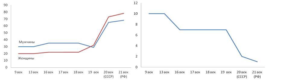Да, за прошедшие 15 веков продолжительность жизни увеличилась и продолжает медленно расти, но население страны стареет (как и в развитых европейских странах), демографическая обстановка ухудшается. Молодежь в России не стремится рожать детей и не только потому, что это не модно. Последние 30 лет в стране лучше жить не стало, как экономически, так и политически. Экономические кризисы повторяются всё чаще, рост зарплаты или доходов большинства каждые десять лет съедается инфляцией, ведь страна продолжает жить за счет продажи природных ресурсов. Растет зависимость страны от внешних поставщиков техники, товаров и продовольствия – промышленность, сохранившаяся со времен СССР, изношена, требует замены и не способна использовать новые технологии.