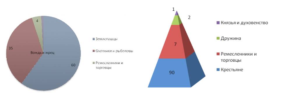 Рисунок 4. Изменение структуры общества в %-ном отношении (слева – колесо в 5 веке, справа – пирамида в 10-13 веках)