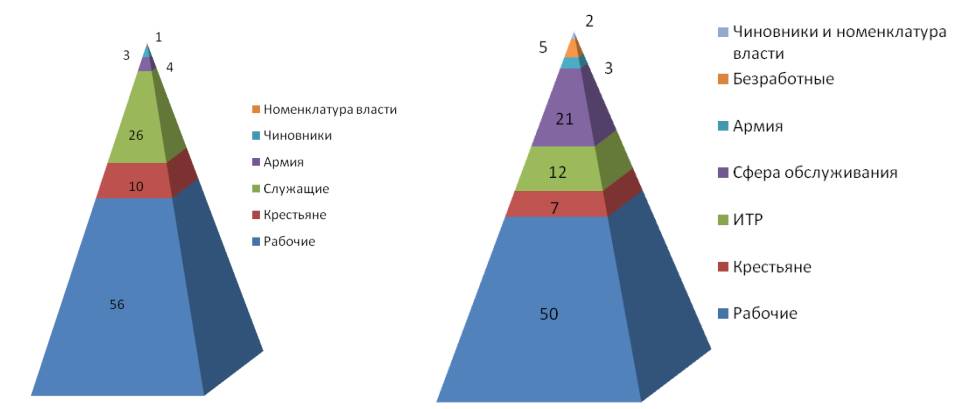 Рисунок 6. Изменение структуры общества в %-ном отношении (слева – в 20 веке, справа – в 21 веке)