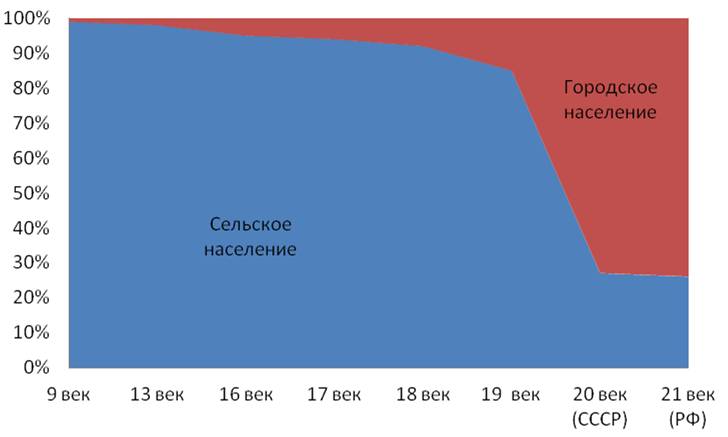 Законы экономического развития действуют независимо от того, как их воспринимают люди. Повышение производительности труда в сельском хозяйстве вызвало сокращение трудовых ресурсов, которые перемещались в города, где строились заводы и фабрики, где росла потребность в обслуживающем персонале. За сотню лет большая часть населения переместилась в города и рабочие поселки.