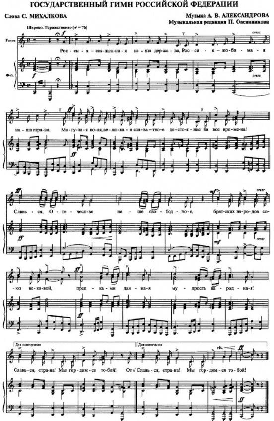 Но, конечно, самые сильные патриотические чувства, такие, что сдавливает горло, что слёзы наворачиваются на глаза, вызывает в нашей душе музыка гимнов. Государственный гимн Российской Федерации появился у страны накануне нового ХХI века, в декабре 2000-го года. Текст гимна утвержден Указом Президента России Владимиром Владимировичем Путиным 30 декабря 2000-го года. Стихи нового гимна России создал известный писатель Сергей Михалков. Музыка гимна осталась от старого гимна – Советского Союза, её сочинил композитор Александров. Порядок исполнения государственного гимна определяется специальным законом. Гимн исполняется в особо торжественных случаях и в точном соответствии с утверждённом музыкальном и поэтическим текстом. Государственный гимн можно исполнять во время проведения каких-либо торжественных мероприятий и праздников, при исполнении воинских ритуалов, при встречах и проводах официальных представителей иностранных государств, при открытиях и закрытиях заседаний Государственной Думы и Совета Федерации и, конечно, при вступлении в должность руководителей органов государственной власти и Президента Российской Федерации.