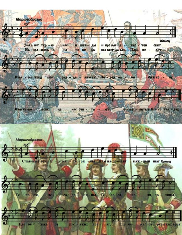 Пойдем, братцы, за границуБить Отечества врагов.Вспомним матушку-царицу,Вспомним, век ее каков!Славный век ЕкатериныНам напомнит каждый шаг,Те поля, леса, долины,Где бежал от русских враг.Вот Суворов где сражался!Там Румянцев где разил!Каждый воин отличался,Путь ко славе находил.Каждый воин дух геройскийСреди мест сих доказалИ как славны наши войскиЦелый свет об этом знал.Между славными местамиУстремимся дружно в бой!С лошадиными хвостамиПобежит француз домой.За французом мы дорогуИ к Парижу будем знать.Зададим ему тревогу,Как столицу будем брать.Там-то мы обогатимся,В прах разбив богатыряИ тогда повеселимсяЗа народ и за Царя.4. Звучит «Марш Преображенского полка»