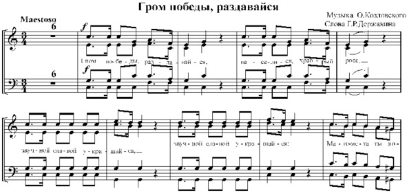 Автором слов этого гимна был поэт и государственный деятель Гаврила Романович Державин. Некоторое время Державин был губернатором Тамбовской губернии. Он родился в 1743 году и умер уже после Отечественной войны 1812 гола, в 1816 году. А музыку марша-полонеза. «Гром победы, раздавайся!» сочинил композитор Козловский. Этот гимн венчал многочисленные победы российского воина и российского оружия. Он стал песнью той эпохи, когда империя достигла расцвета, когда турки, в результате русско-турецкой войны 1787—1791 годов были сломлены и Россия торжествовала, окончательно закрепившись на Чёрном море. «Гром победы» остался в истории одним из неофициальных гимнов России.
