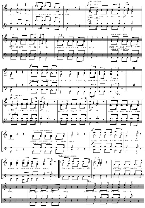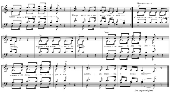 Гром победы, раздавайся!Веселися, храбрый росс!Звучной славой украшайся:Магомета ты потрёс!Славься сим, Екатерина,Славься, нежная к нам мать.Воды быстрые ДунаяУж в руках теперь у нас.Храбрость россов почитая,Тавр под нами и Кавказ.Уж не могут орды КрымаНыне, рушить наш покой.Гордость низится СелимаИ бледнеет он с Луной.Зри, премудрая царица,Зри, великая жена,Что твой взгляд, твоя десница —Наш закон, душа одна.Зри на блещущи соборы,Зри на сей прекрасный строй.Все сердца тобой и взорыОживляются одной.Славься сим, Екатерина,Славься, нежная к нам мать!6. Звучит гимн «Гром победы, раздавайся»