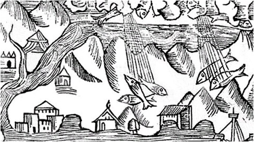 Рисунок 32. Гравюра, изображающая «рыбный дождь» (О. Магнус, 1555 г.)
