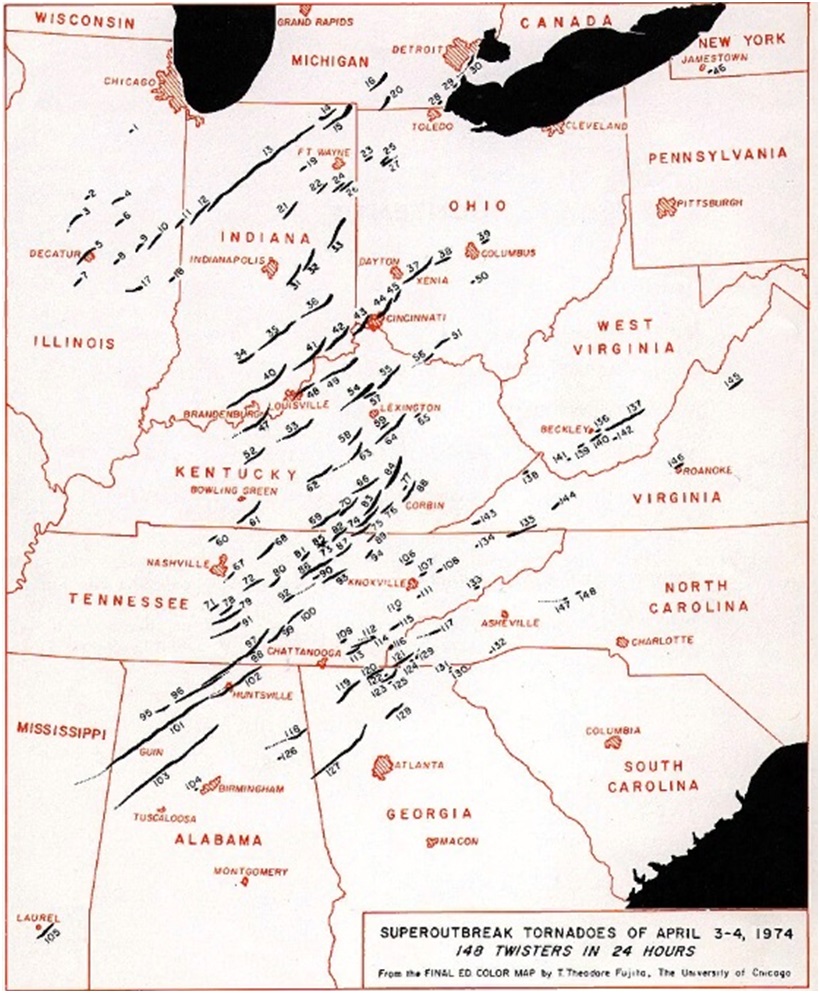 Рисунок 35. Карта путей торнадо во время их «супервспышки» в США 3-4 апреля 1974 г.