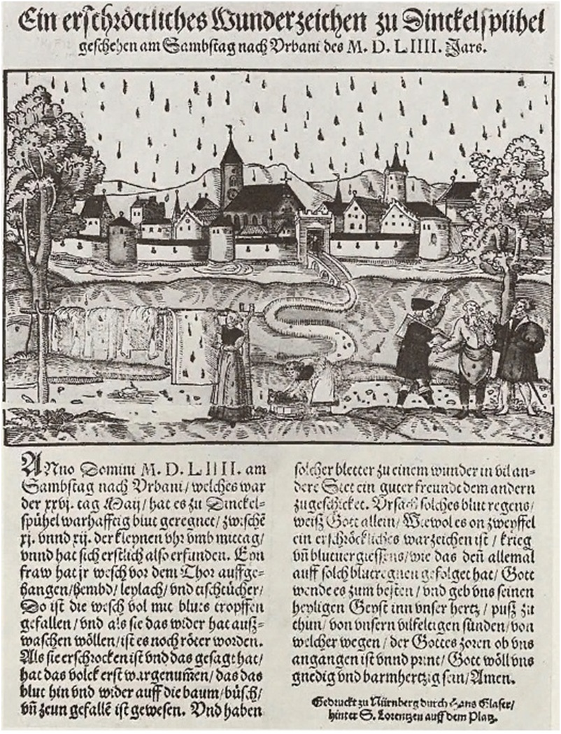 Рисунок 37. Гравюра на дереве Ганса Глейзера, изображающая «кровяной дождь», который прошел недалеко от Динкельсбуля 26 мая 1554 года