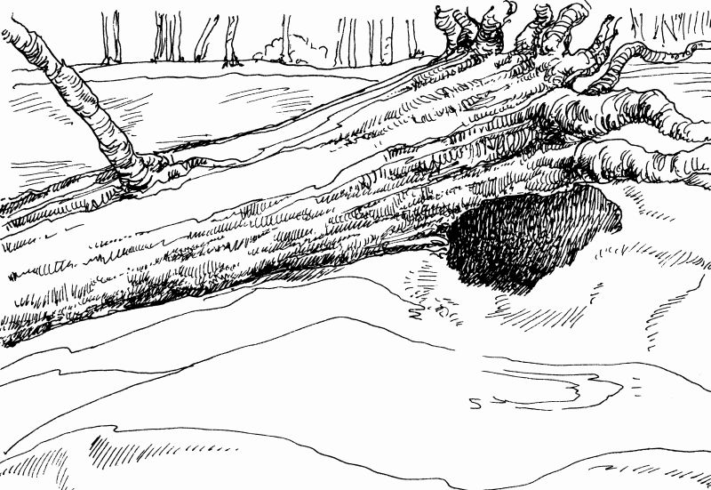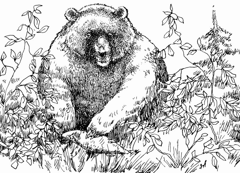 Но если медведь сумеет накопить за год жиру, то к зиме он ложится в берлогу. Он раскапывает яму в густой чаще, кладет на дно ветки и мох. Иногда он выбирает себе для берлоги места у корней поваленного дерева. После того как зверь заберется в это своеобразное гнездо, он прикрывает себя сверху ветками.