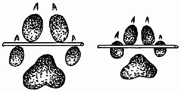 След волка оставляет прямую линию, что можно объяснить тем, что при передвижении волка шагом или рысью отпечатки его лап располагаются почти на прямой линии, и чем быстрее ход, тем прямее линия следов. Следы волка схожи с отпечатками лап собаки, и все же имеются некоторые признаки, по которым их можно различить. У волка след стройнее, более вытянут, а когти и подушечки пальцев четче отпечатываются на снегу. Определить, чьи это следы, можно довольно простым способом. Отпечатки двух средних пальцев волчьей лапы выдвинуты вперед, поэтому между ними и отпечатками крайних пальцев поперек следа можно положить соломинку. Такая же соломинка, положенная поперек следа собаки, будет одновременно касаться и пересекать отпечатки всех четырех пальцев, так как пальцы собачьей лапы как бы собраны в комок и на снегу отпечатываются более слитно.