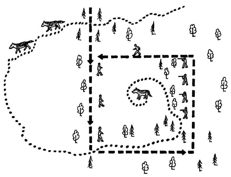 Кроме стрелков, притаившихся на номерах, в облавной охоте участвуют и загонщики, цель которых – поднять волка с лежки. Загонщики не должны сильно шуметь. Лучше всего действовать таким образом, чтобы хищник принял людей как досадное обстоятельство, нарушившее его отдых, и потихоньку побежал к месту лазов. Такого идущего трусцой зверя бить очень легко.