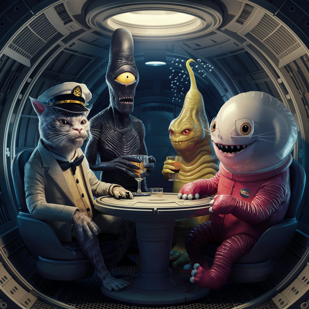 Космос. 2050 год. В небольшой капсуле за круглым столом сидят четверо инопланетных существ. Говорящий кот, высокое, одноглазое и узкое черное чудище, слизень, который постоянно что-то бормотал на своем языке. Последний из них-большой надувной белый шарик с пластиковыми глазами.
