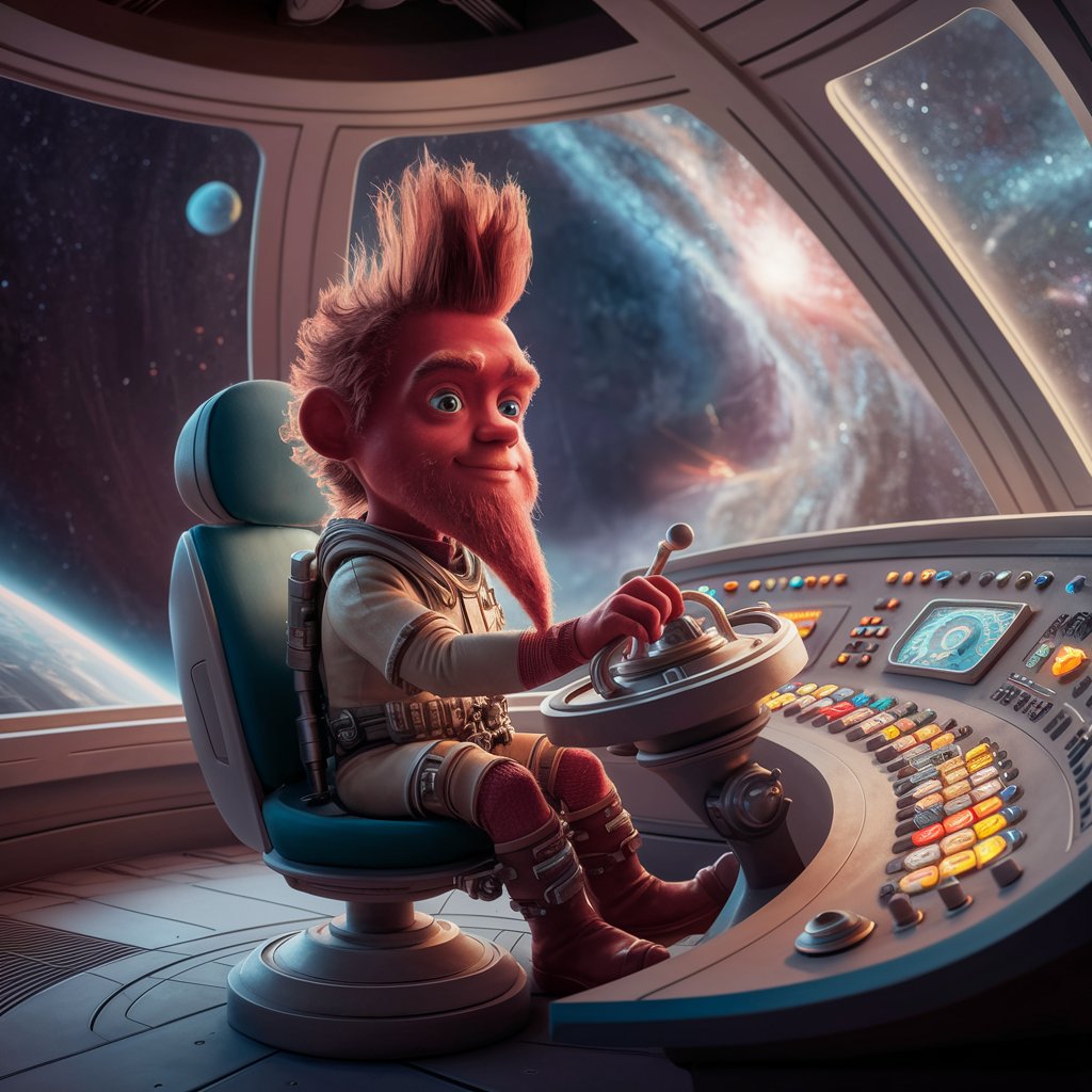 Космос. Тоже 2050 год. Летит большой космический корабль, размером с кита. Маленький красный человечек по имени Карл с высокими волосами и длинной бородой сидит за штурвалом. Вместе с ним также путешествует его верный друг, человек без имени, которого похитили инопланетяне когда ему был один год. Будем называть его Безымянным. У него черные волосы с челкой, но из-за того, что он не знает как за ними ухаживать, они постоянно взъерошены.