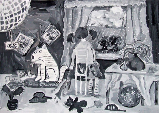 У меня есть беда —У меня нет кота.Я мечтаю о нёмНочью, утром и днём,А потом, когда вечер уж в теме,Я сажусь на кровать,Чтобы нарисоватьТо, о чём я мечтаю всё время.Вот мой будущий кот —Он живет без забот.Лишь откроет он рот —Сразу птичка впорхнёт.Он упитан, ухожен и томен.Нарисую котуЯ любую еду —У меня выбор красок огромен.