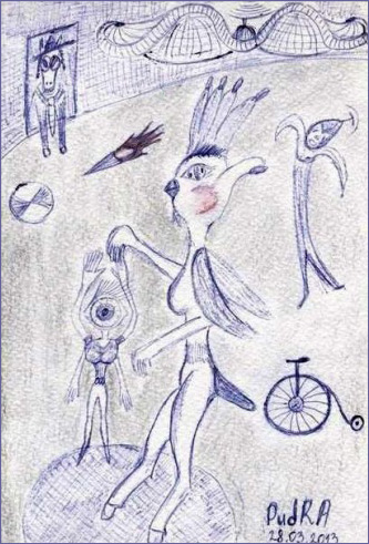 Рисунок странен. Очень даже.Влияние Босха? Кто-нибудь скажет?Бурна фантазия, бьёт ключом…Бумаге, однако, всё нипочём.