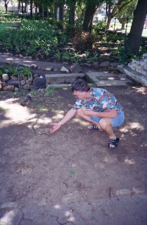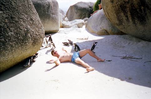 Саймонс Таун оказался военно-морской базой Южноафриканской республики. Мы прошли вдоль всего военно-морского порта с одним военным кораблем и одним кораблем поддержки. По дееспособности и количеству военных судов Южная Африка, как мне показалось, не многим превосходит Новую Зеландию. Путь на пляж нам сначала показал бравый морской офицер (он же объяснил нам и путь в ближайший винный магазин), а затем местная бабулька, которая довела нас до пляжа. Добирались мы туда минут 20-25 и наши дамы (Инна со своими новыми подружками) устали и приуныли, поэтому мы оставили их на пляже, а сами пошли искать приключений дальше. Не пройдя и пятидесяти метров от пляжа, мы обнаружили резервацию пингвинов, открытую для туристов, и вход в которую стоил 10 рандов. Купили билеты и прошли внутрь. Это оказалась довольно большая колония южноафриканских очковых пингвинов и пингвинов Адели. От души поснимав славных птичек мы решили пройти дальше и вскоре натолкнулись на совершенно потрясающий пляж с песком и огромными гранитными валунами (как я потом выяснил, пляж так и назывался: Boulders beach). На пляже, прямо среди людей, деловито бродили те же самые пингвины, ничуть людей не боявшиеся и даже наоборот, норовящие тяпнуть за палец, если кто-то проявлял слишком большую фамильярность. Раскованность пингвинов была столь велика, что когда мы лежали после купания на песке, к нам подошел один из пингвинов и отложил яйцо почти мне под нос. Я был тронут таким доверием. Люди здесь тоже вели себя раскованно. Рядом с нами две голландские лесбиянки загорали в разных позах и ходили купаться совершенно нагими. Из Москвы я взял с собой маску с трубкой и ластами и от души понырял. Дно оказалось очень интересное с большим количеством рыбы, ракушек и прочей живности. Было много огромных, до 5 метров высотой бурых водорослей, которые мы и видели в Аквариуме. К сожалению, вода была не очень прозрачной, вероятно взмутилась после шторма – за пару дней до этого был очень сильный ветер. И, тем не менее, мне удалось достать со дна местную ракушку, размером больше чем с кулак, которую храню до сих пор дома. Примерно в 4 часа по полудни мы сели на обратную электричку и вернулись в Кейптаун.
