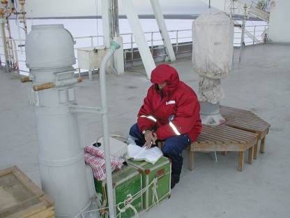 4. А.Плишкин измеряет гранулометрический состав аэрозолей на пеленгаторной палубе.