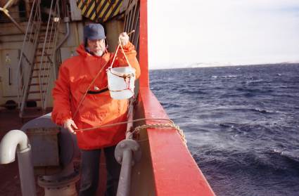 5. Автор отбирает поверхностную морскую воду ведром на ходу судна.