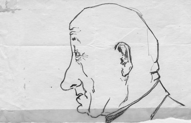 Один из вариантов профиля И. И. Малхазова, выполненных» Шимром» на листке из блокнота, случайно сохранился в моем фотоальбоме. Этот рисунок, несмотря на некоторую утрированность, довольно узнаваемо воспроизводит черты внешности нашего преподавателя.