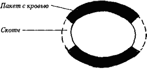 Для постановки собаки на кровь к перечисленному снаряжению следует добавить несколько воздушных шаров или небольших прочных кульков. Их наполняют говяжьей кровью или человеческой кровью и скотчем крепят к щитку в месте предполагаемого удара клыками (рис. 20).