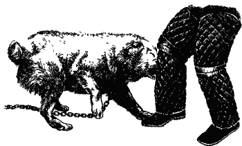Как только собака схватила дрессировочный рукав, он сбрасывает его и тут же подставляет для укуса правую руку. Как только собака «берет» вторую защищенную руку, «злоумышленник» левой рукой выхватывает палицу и размеренными движениями наносит один несильный удар по голове и один – по лапам.