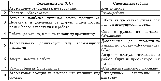 Как видно из этой таблицы, спортивная собака имеет другую ориентацию и множество моментов, попросту «противопоказанных» телохранителю.