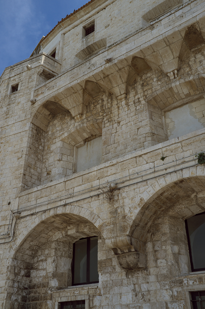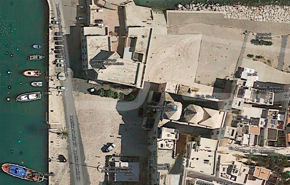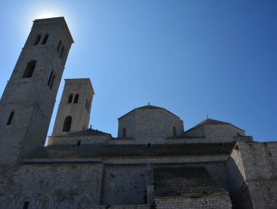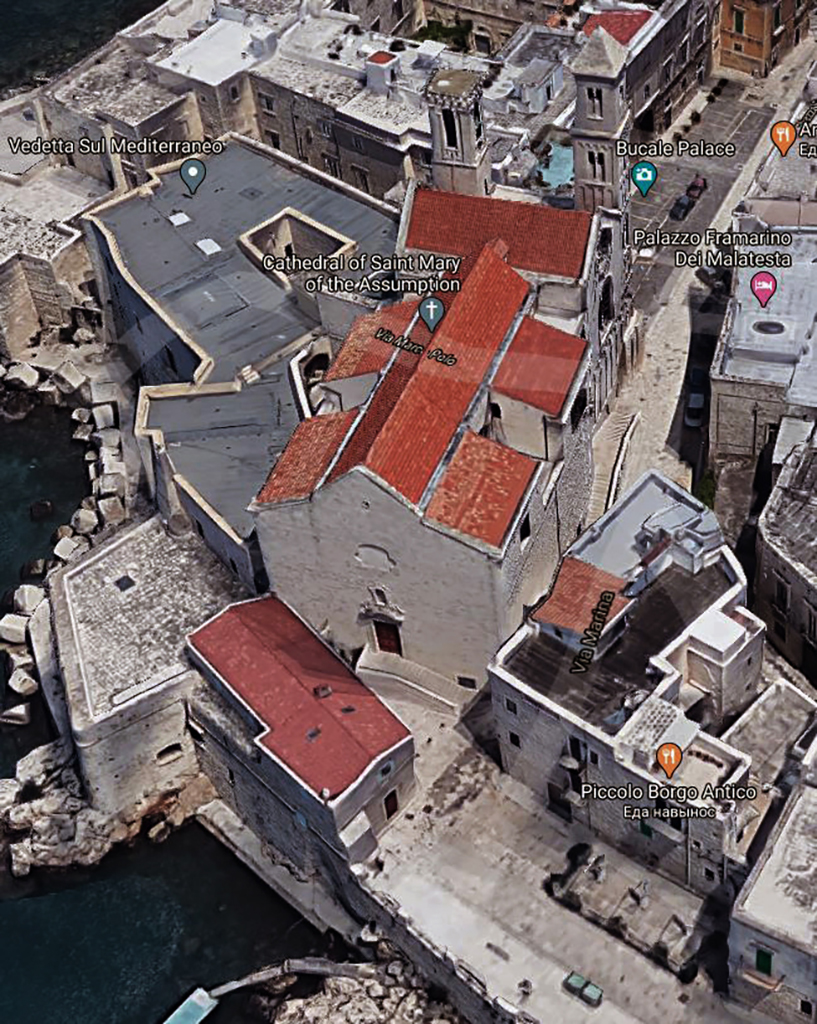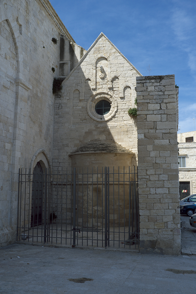Собор построен почти на самом берегу моря. Как ни странно, его выходящий на набережную восточный фасад абсолютно лишен декора. Главным входом, как и в соборе Мольфетты, служит дверь в южном фасаде.