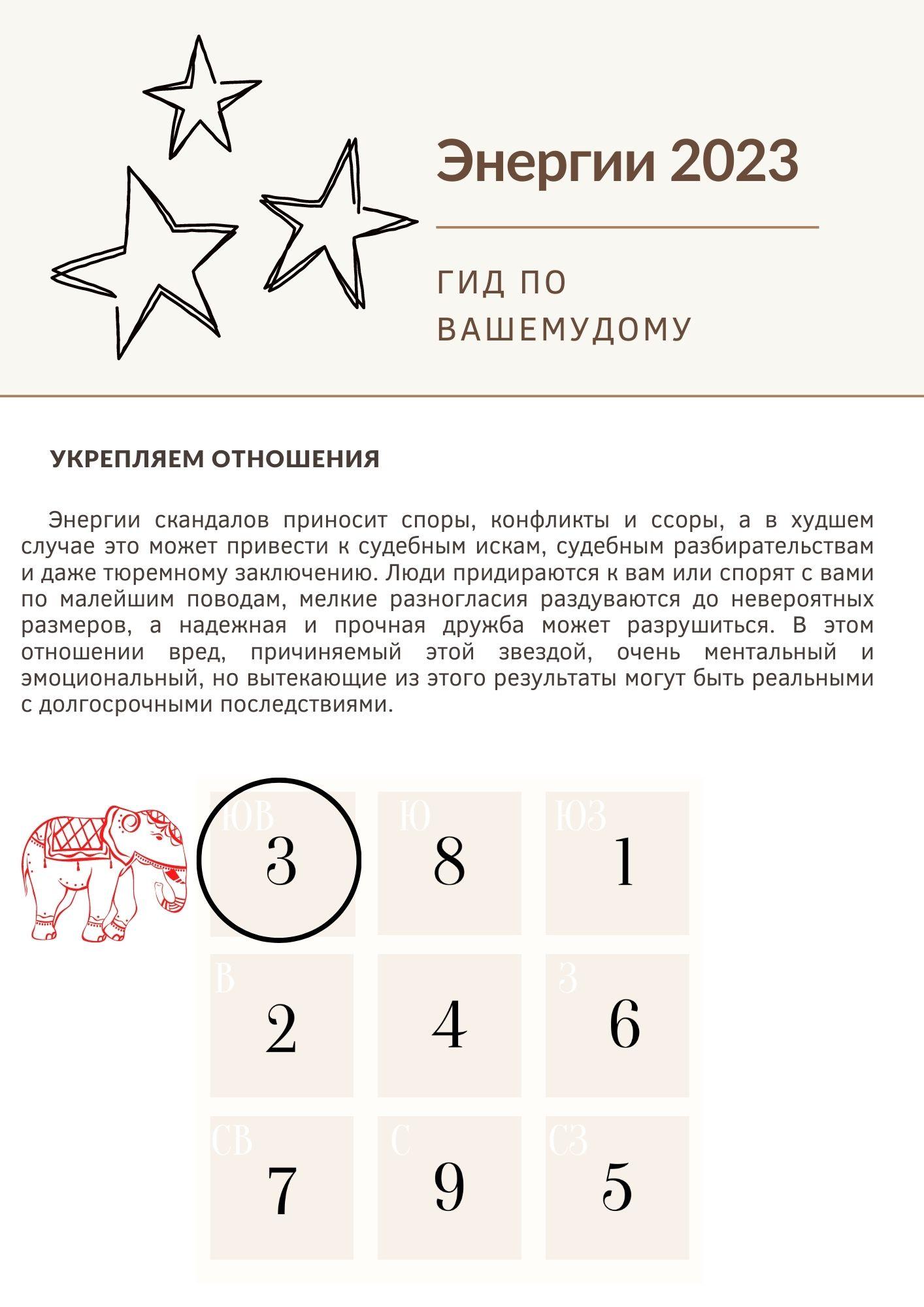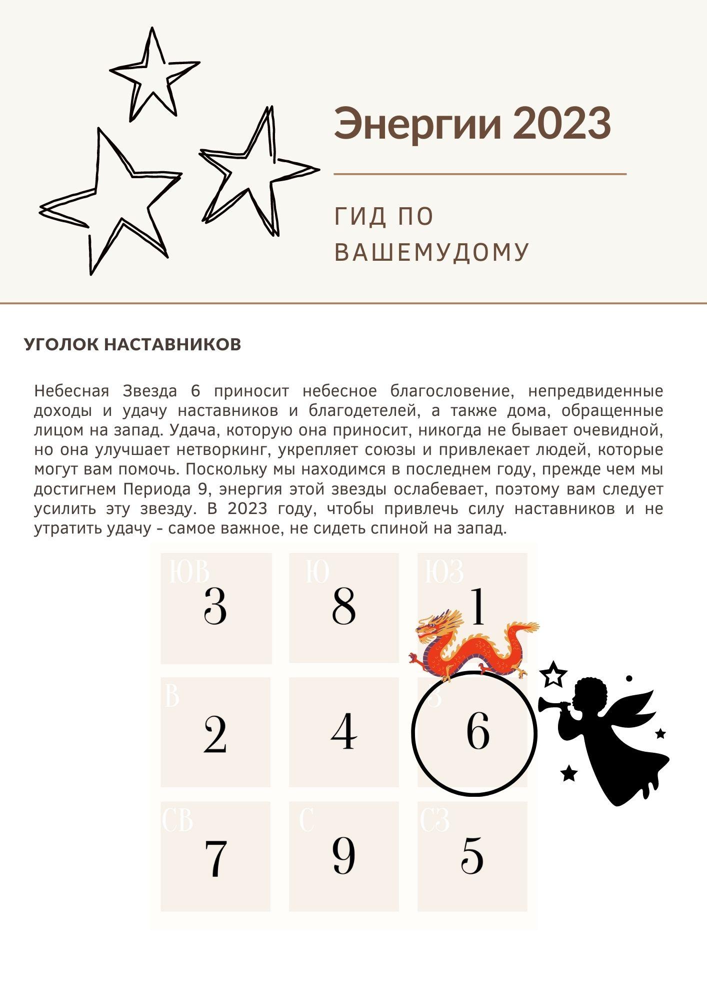 В 2023 году доминирующей звездой является 4, поэтому она будет иметь наибольшее влияние в каждом доме. Таким образом, необходимо максимально использовать эту звезду, поскольку счастливые эффекты звезды 4 медленно меняются по мере того, как мы переходим к периоду 9. Усиление эффекта этой звезды в каждом доме чрезвычайно важно.