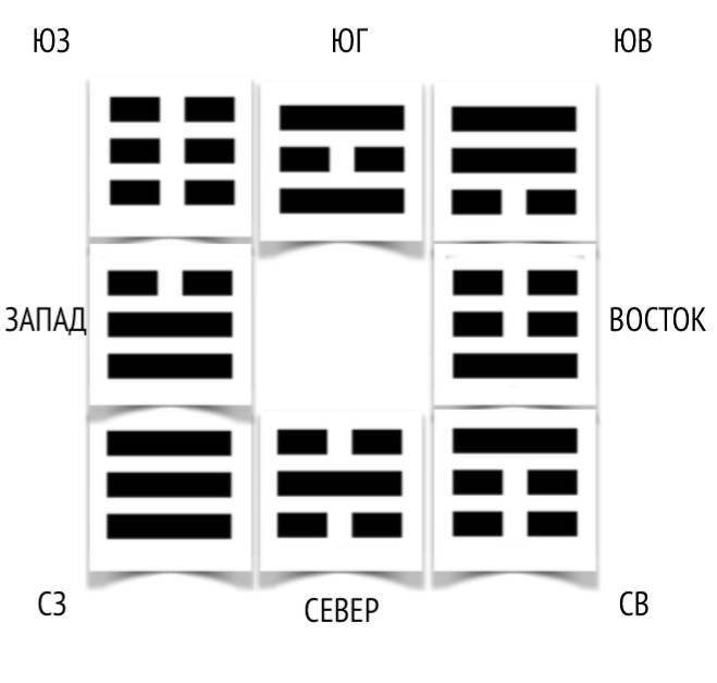 Восемь иероглифов, обозначающие взаимодействие Неба и Земли, называются триграммами. Девятое направление – это центр. Каждая триграмма обозначает энергию, которая взаимодействует с остальными триграммами, обозначающими 9 звезд.