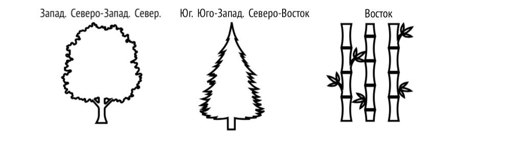 Восток. Юг. Юго-Восток. (Форма деревьев: Прямоугольная). Символизирует элемент Дерева.