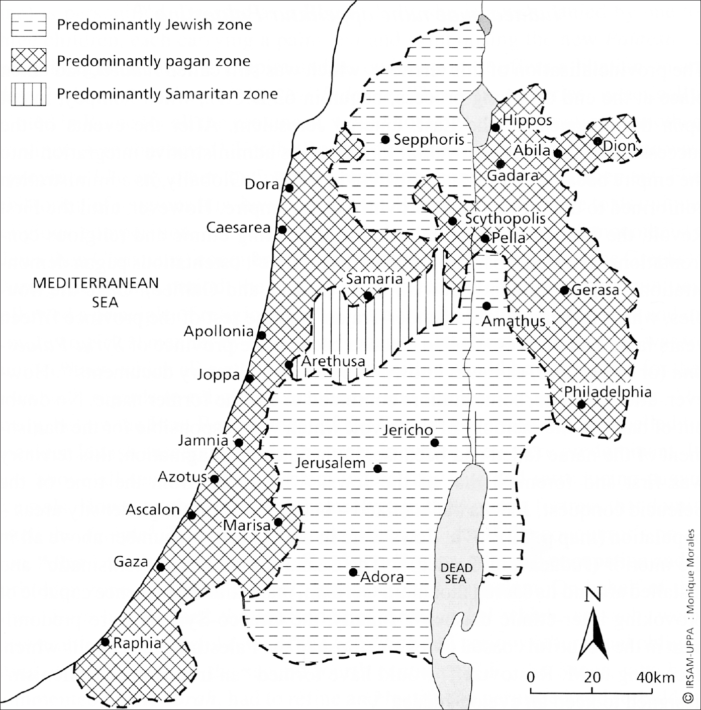 Die oben abgebildete Karte stellt für die Zeit vor dem ersten jüdischrömischen Krieg 66–70 v. Chr. den geographischen Raum dar, auf den sich die Evangelienüberlieferung und große Teile der Apostelgeschichte beziehen. Sie unterteilt nach dem Kriterium der ethnischreligiösen Zugehörigkeit der Bevölkerungsmehrheit in jüdische, pagane und samaritanische Siedlungsgebiete. Die als überwiegend jüdisches Siedlungsgebiet bezeichneten Regionen umfassen Galiläa, westlich vom See Genezareth mit der Metropole Sepphoris, und Judäa mit Teilen Transjordaniens, also den Jordangraben und das östliche und westliche Bergland mit Jerusalem als Zentrum. Die Karte macht deutlich, dass im Gebiet, das auch die jüdischen Autoren Flavius Josephus (ca. 37–100 n. Chr.) und Philo von Alexandrien (ca. 15 v. Chr.– 40 n. Chr.) Palästina (gr. Palaistine; Παλαιστίνη) nennen, neben der jüdischen Bevölkerung auch eine teilweise hellenisierte nichtjüdische Bevölkerung anzutreffen war, die insbesondere im Küstenstreifen zum Mittelmeer mit dem Sitz des römischen Präfekten in Caesarea und im Gebiet der zehn Städte (Dekapolis) mit Skythopolis und Gerasa südlich und südöstlich des Sees Genezareth lebte. Diese pagane Bevölkerung war in sich recht heterogen, teilte aber die kulturellen und religiösen Ansichten der hellenistisch-römischen Welt, d. h. stand einem religiösen und kulturellen Synkretismus weitgehend aufgeschlossen gegenüber. Zudem lag zwischen den jüdischen Siedlungsgebieten Galiläa und Judäa das Gebiet der Samaritaner. Dabei handelt es sich um eine bis in die Gegenwart existierende religiös-ethnische Gruppierung, die sich zwar auf die fünf Bücher Mose, den Pentateuch, beruft, sich aber etwa im 2. Jh. v. Chr. von dem nach Jerusalem orientierten Judentum abgespalten hat und den Berg Garizim als wichtigsten heiligen Ort betrachtet.