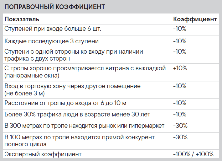 Далее подбираем коэффициент конверсии, который соответствует данному типу трафика. Если проект смешанный, приходится брать в расчет несколько цифр. К этим данным применяем коэффициенты коррекции, учитывающие такие факторы, как наличие ступенек, обзорность витрины, конкуренты и прочее.