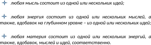 Вот откуда пришёл вывод, что всё во Вселенной взаимосвязано, даже кажущиеся на первый взгляд разные творения в своих основах всегда имеют одну и ту же природу, один и тот же закон, истину или «код», по которым построен весь Мир. От простого к сложному, всё усложняясь и усложняясь, логически очень легко доказуемо – собрав примитивное творение можно на основе опыта и новых полученных величин собирать новое и более сложное творение, устремляясь в бесконечность усложнения Вселенной. Так идея «обрастает» энергиями, а энергии «обрастают» материей.