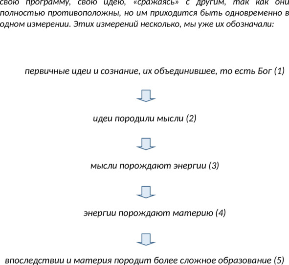 Потом, постепенно, эти сознания от порождённых ими мыслей рождают энергии, и этих энергий становится всё больше, и из них рождается материя, и так далее. Так появляются всё новые и новые творения и вытекающие из них более сложные образования. Но тут есть одно очень важное отступление. При рассмотрении этих первичных процессов эволюции двух начал, мы не затронули третье, более сложное сознание – сознание Бога. Это сознание рождается одновременно с двумя противоположными сущностями, в одном измерении, в одном времени и являет их полное сочетание в себе. Это не очень сложно понять, но всё-таки нужно постараться.