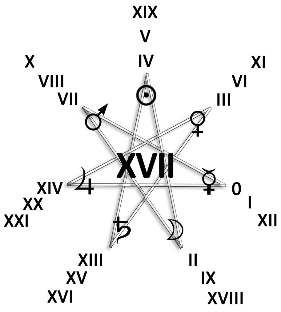 – XVII – Звезда – не входит ни в одну из «троек» и отражает особенные, исключительные, важные для человека события. Это центральная, ключевая карта всей колоды.