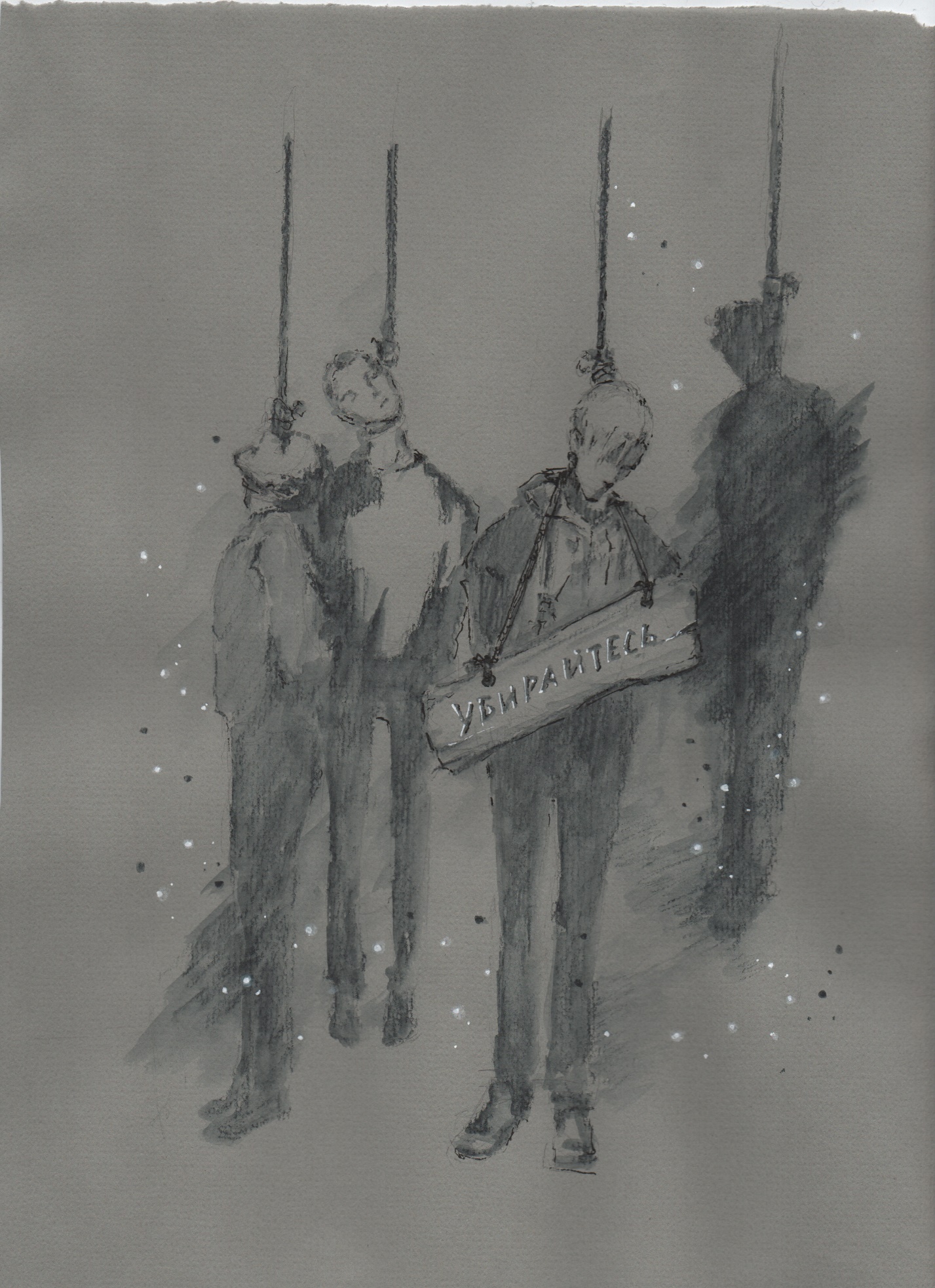 – Как «кто»? Они! – ответил Ивраоскарь, указывая рукой на Михея, Марка, Егора и Тибо, болтающихся в петле, с табличками на шее, ровно на том месте, где раньше стоял огромный космический корабль.