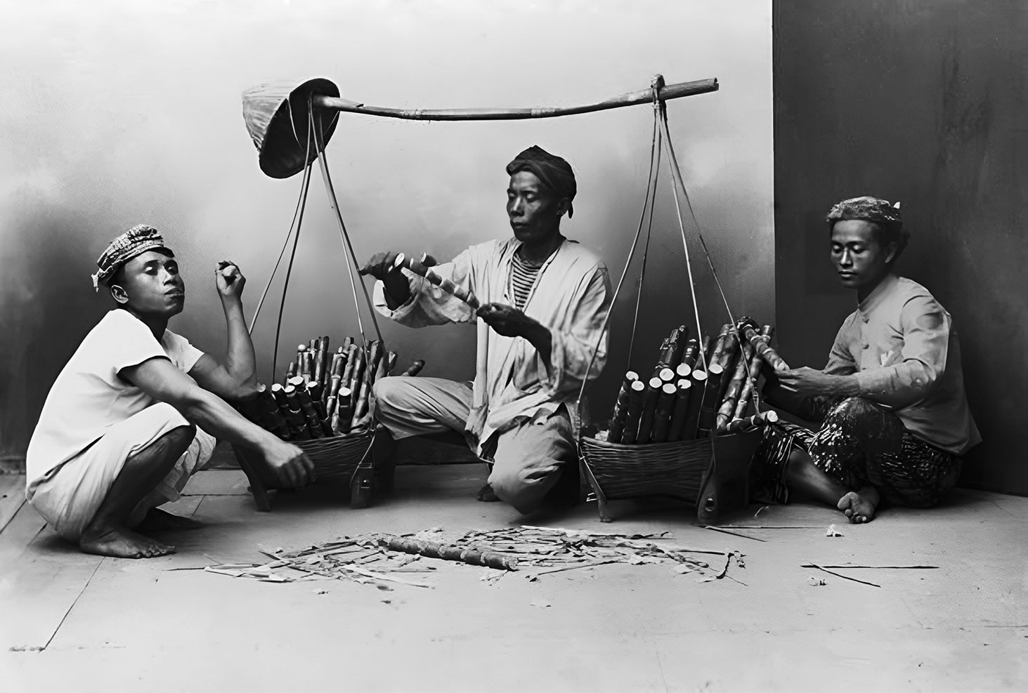 Уличные торговцы продают сахарный тростник. Ява, ок. 1915. Стебли сахарного тростника пользуются популярностью и сегодня – это сладкое лакомство продается во всем мире