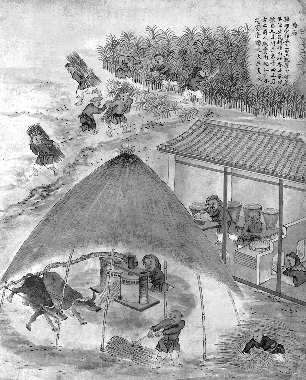 Сахарная мельница. Из книги Лю Ши Ци «Иллюстрации диких деревень Тайваня» (Illustrations of Taiwan Savage Villages) (1744–1747). В начале XVIII века Тайвань был крупнейшим экспортером сахара
