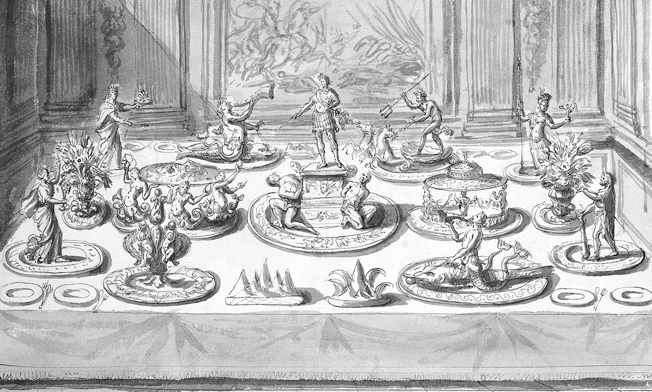 Пьер Поль Севин. Пиршественный стол с трилистниками, устроенный для кардинала Леопольдо Медичи (1667) изображает сахарные скульптуры, украшающие стол аристократа. Украшение стола при помощи литого сахара-рафинада на протяжении веков было светской практикой, распространенной в кругах европейских, средиземноморских и китайских сановников