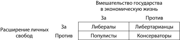 В целом, если посмотреть на тех, кто называет себя либералами или консерваторами, можно заметить некую закономерность. Либералы, как правило, выступают за усиление вмешательства государства в экономическую жизнь – налоги и регулирование – и уменьшение вмешательства государства в свободу слова и личных решений. Консерваторы, как правило, выступают за уменьшение вмешательства государства в экономическую жизнь и усиление вмешательства государства в вопросы свободы слова и личной свободы. Некоторые политологи считают, что эта классификация лучше описывает политический спектр современной Америки; того, кто не вписывается в эту классификацию, называют «запутавшимся». Политологи Уильям Мэддокс и Стюарт Лили в книге «Beyond Liberal and Conservative» задают простой вопрос: «Поскольку этот подход имеет два измерения – экономические вопросы и личные свободы, – каждый из которых имеет два значения, не стоит ли исходить из четырех возможных комбинаций?» Они предложили схему, приведенную ниже.