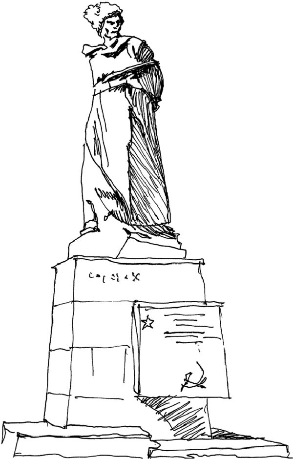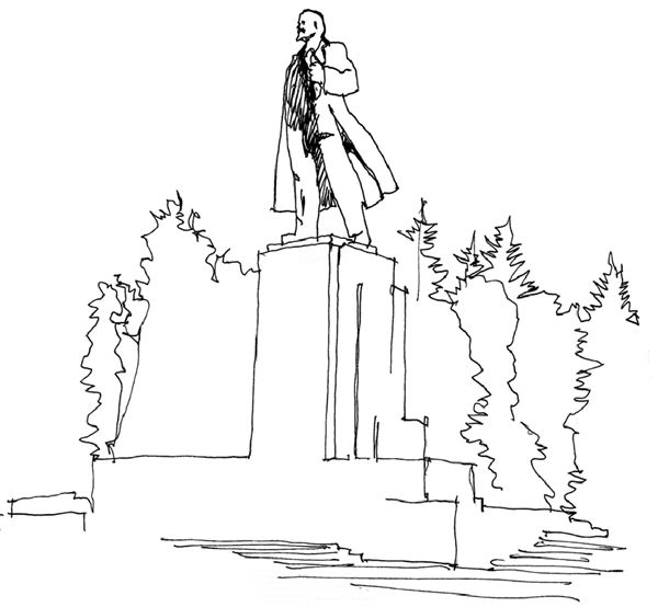 12Самое «святое» в городе – памятник Ленину. С художественной точки зрения с ним всё в порядке. Но у архитекторов живет про него байка – как на открытии памятника изумленные горожане насчитали у Ильича две кепки – одну на голове, а другую он сжимал в руке (отсылаю читателя к прозе Сергея Довлатова, где он отразил этот факт, кажется, в «Записных книжках»). Чтобы исправить положение, лишнюю кепку стали срубать с головы, потому что технологически это более предсказуемо: если откалывать кепку в руке, то она, скорее всего, отломится вместе с рукой. С тех пор голова Ленина слегка неровная и очень любима голубями. В профиль памятник тоже походит на голубка.