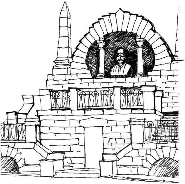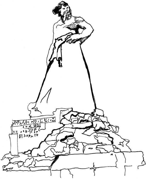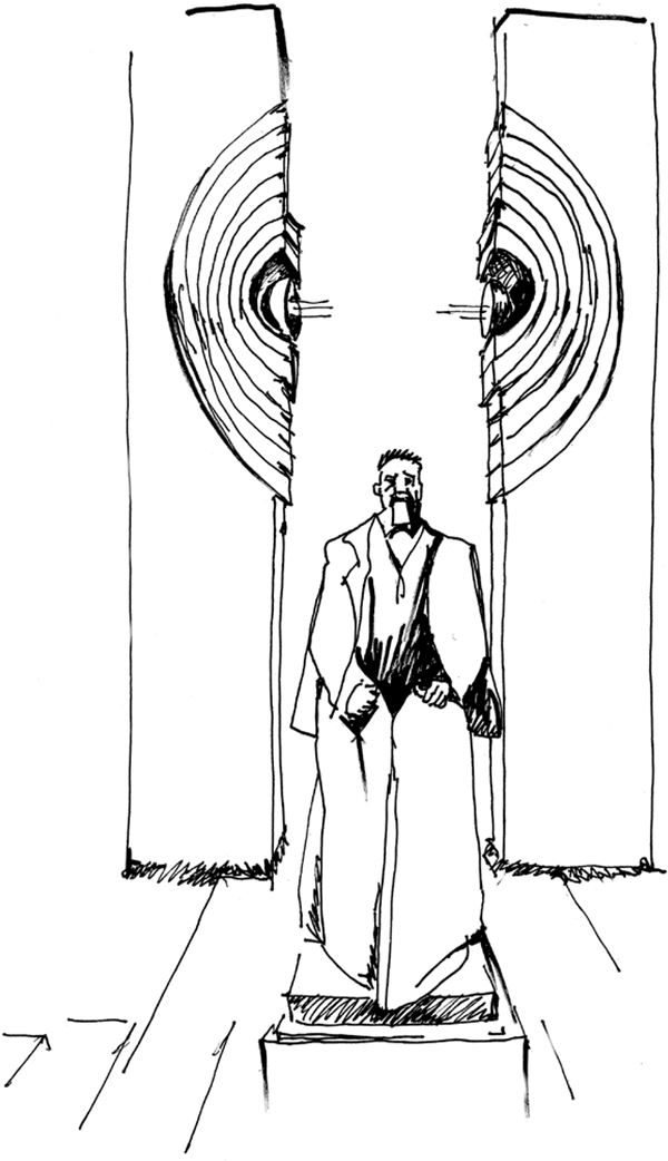 14Инфернальнее всего памятник Расщепленному Атому на замыкании главного проспекта. Два огромных пилона, стоящих с двух сторон от вдвое меньшей фигурки человека, берут его под стражу, как вертухаи в шарашке, где человек – ученый создавал «мирный атом». Аллегория распада мира явственно проступает нимбом над головой фигуры физика Игоря Курчатова.