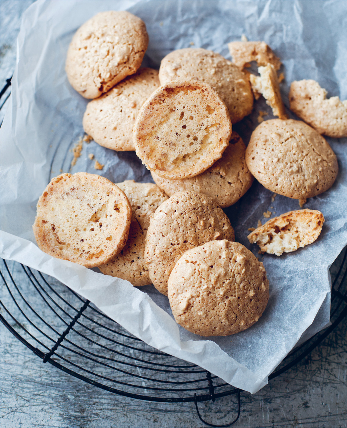 Grease a baking sheet (or use a non-stick baking tray liner), as they are quite sticky. Using a tablespoon, place little dollops about 3–4cm apart (they spread a little when cooking), onto the baking sheet and bake for 30 minutes. Remove from the oven and leave to firm up on the tray and dry out a little, then transfer to a wire rack to cool. They can keep for a while in a tin but are so good they will soon be devoured.