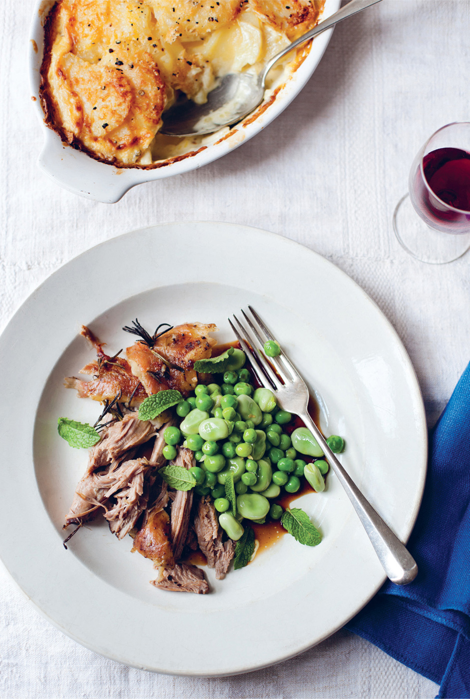 Pull the meat away from the bone in pieces and serve with the peas and broad beans and the juices from the pan.
