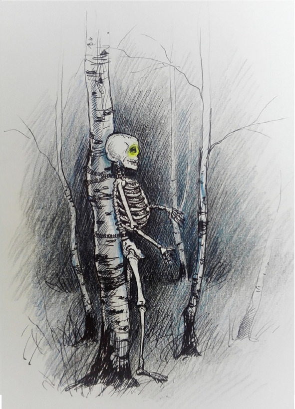 И вот, передвигаясь вдоль свежих следов, внимательно в них вглядываясь, я, чтобы сориентироваться у перехода в молодом березняке, поднял от земли глаза и тут-то меня и прошиб пот: я увидел прямо перед собой человеческий череп! К молоденькой березке был куском телефонного провода привязан скелет человека. Его глазницы отсвечивали зеленоватым цветом. Как потом оказалось, их натерли фосфорным карандашом.