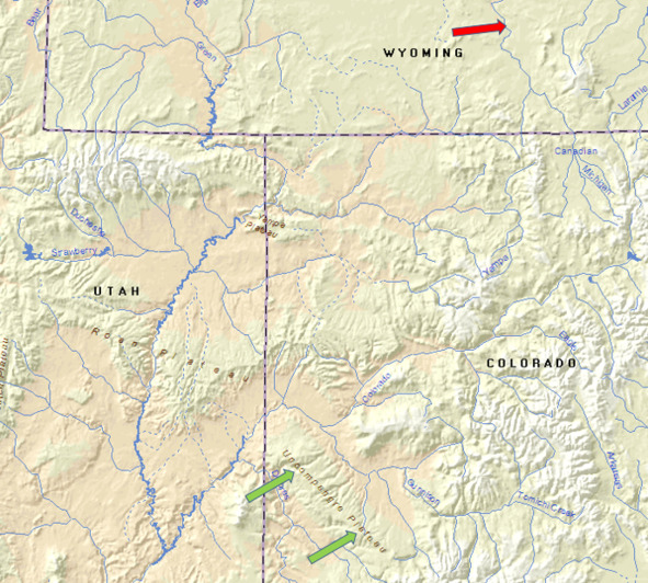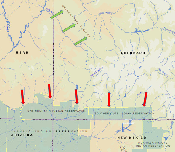 Лес Анкомпагре (зеленые стрелки), резервации, куда были выселены большинство племен народа юта (красные стрелки)