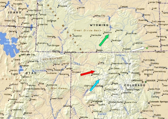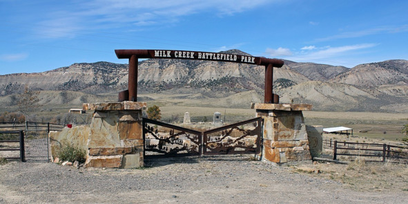 Место сражения у Милк-Крик (красная стрелка), место первоначальной резервации ютов на Белой Реке (голубая стрелка), форт Фред Стил (зеленая стрелка), форт Рассел (белая стрелка)