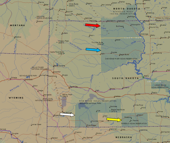 Индейские резервации в штатах Северная и Южная Дакота. Резервация Пайн-Ридж (белая стрелка), резервация Роузбад (желтая стрелка), резервация Стэндинг-Рок (красная стрелка), резервация на реке Шайен (голубая стрелка)
