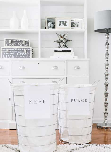 Мой лучший совет – устроить станцию расхламления. Без этого никак! Найдите три больших контейнера, в идеале – возьмите уже имеющиеся у вас дома. Отлично подойдут корзины для белья или даже большие пакеты для мусора. На каждом контейнере или пакете напишите «выбросить», «оставить» и «отдать». Поставьте контейнеры или пакеты в центр комнаты, в которой планируете работать.