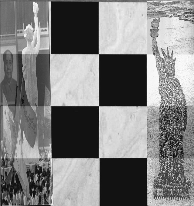 Рис. 1. Светлана Бойм. Шахматная доска – коллаж, объединяющая фотографию людей, стоящих в форме статуи Свободы, 1918 год, и Богиню Свободы и Демократии с площади Тяньаньмэнь, Пекин, Китай, 1989 год.